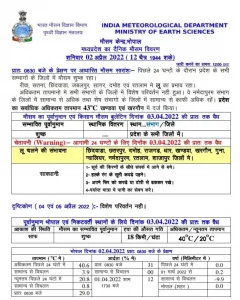 एमपी मौसम विभाग के अनुसार, आज 2 अप्रैल 2022 को छिंदवाड़ा, छतरपुर, दमोह, राजगढ़, धार, खरगोन, खंडवा, गुना, ग्वालियर, नर्मदापुरम, रतलाम और शाजापुर आदि जिलों लू का येलो अलर्ट जारी किया गया है। पिछले 24 घंटे में सबसे अधिकतम तापमान 43 डिग्री सेल्सियस खरगोन और खंडवा में दर्ज किया गया है ।पिछले 24 घंटे में रीवा, सतना, छिंदवाड़ा जबलपुर, सागर, दमोह और रतलाम में लू का प्रभाव रहा।