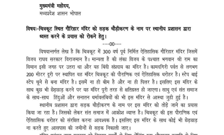 सतना धार्मिक नगरी चित्रकूट में ऐतिहासिक और पौराणिक धरोहरों से छेड़छाड़ को लेकर उठ रहे विरोध के बीच पूर्व विधायक एवं कांग्रेस के राष्ट्रीय सचिव नीलांशु चतुर्वेदी ने खुलकर मोर्चा संभाल लिया है। उन्होंने साधु-संतों और श्रद्धालुओं के समर्थन में मुख्यमंत्री डॉ. मोहन यादव को पत्र लिखकर गौरीहार मंदिर समेत चित्रकूट की पवित्र धरोहरों को तत्काल संरक्षित करने की मांग की है।