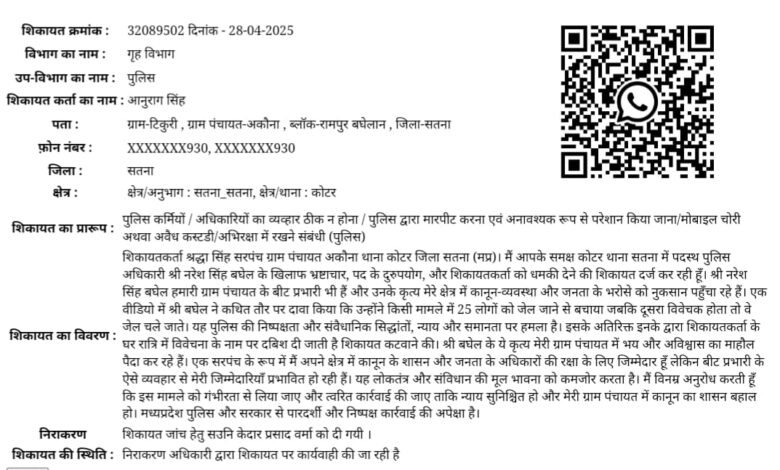 सतना। कोटर थाना क्षेत्र की ग्राम पंचायत अकौना की सरपंच श्रद्धा सिंह ने कोटर थाना में पदस्थ पुलिस अधिकारी एवं बीट प्रभारी नरेश सिंह बघेल पर भ्रष्टाचार, पद के दुरुपयोग, धमकी देने और जनता को अनावश्यक रूप से परेशान करने जैसे गंभीर आरोप लगाए हैं। इस संबंध में उन्होंने पुलिस विभाग और सीएम हेल्पलाईन में शिकायत दर्ज कराई है।